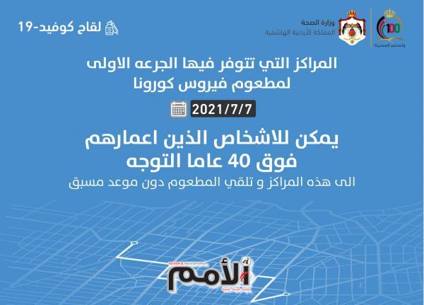– أعلنت وزارة الصحة عن المراكز التي تتوفر فيها الجرعة الاولى لمطعوم فيروس كورونا اليوم الاربعاء والتي يمكن للاشخاص الذين اعمارهم فوق 40 عاما التوجه اليها وتلقي المطعوم دون موعد مسبق.