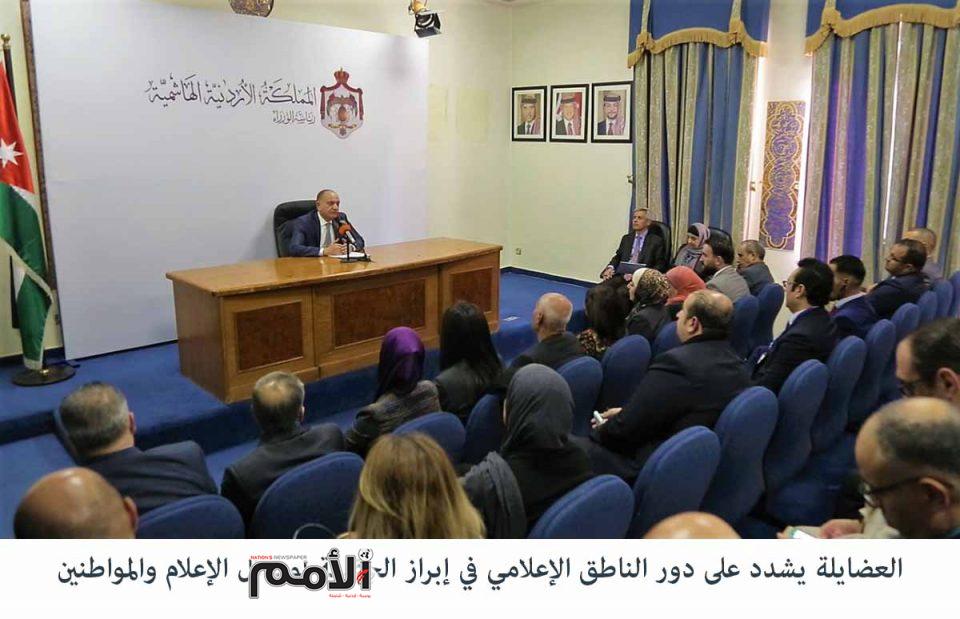 وقال العضايلة، خلال لقائه الناطقين الإعلاميين في الوزارات والمؤسسات الحكومية، اليوم الأحد، في رئاسة الوزراء “الناطقون الإعلاميون في الوزارات والمؤسسات الحكومية، هم وجه وزاراتهم ومؤسساتهم، ودورهم مهم في التواصل الإيجابي والتفاعل مع المواطنين ووسائل الإعلام ومنصات التواصل الاجتماعي”.
