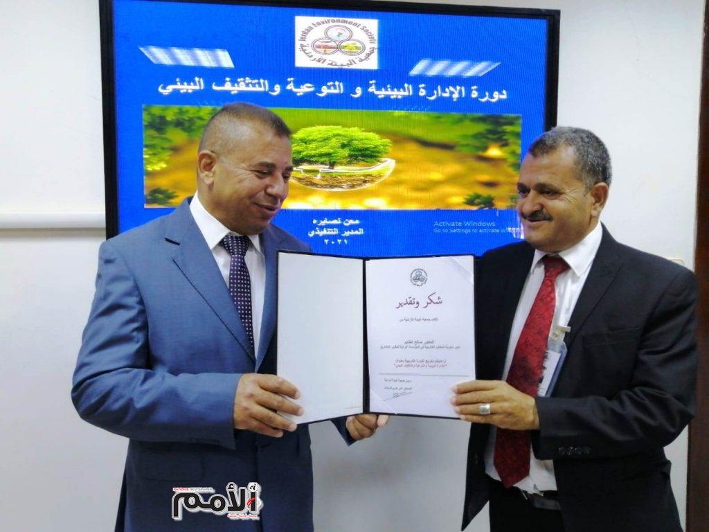 مندوبا عن المدير التنفيذي للمؤسسة الأردنية لتطوير المشاريع الاقتصادية جيدكو عبدالفتاح الكايد رعى مدير مديرية الاتصال الخارجي الدكتور صالح الغنانيم فعاليات تخريج المشاركين بدورة الإدارة البيئية والتثقيف البيئي التي عقدتها جمعية البيئة في قاعة مركز التدريب والقدرات وبناء الاستشارات التابعه لها .