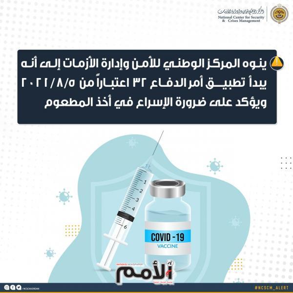 ذكر المركز الوطني للأمن وإدارة الازمات الأردنيين بأن تطبيق أمر الدفاع 32 والذي يفرض اجراءات على عدم متلقي لقاح كورونا، يبدأ يوم 5-8-2021، داعيا الى الاسراع بتلقي اللقاح.
