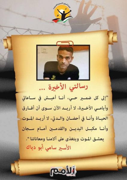 ويعاني الأسير الشهيد أبو دياك، وهو من بلدة سيلة الظهر قضاء محافظة جنين، وجرى اعتقاله بتاريخ 17/7/2002، وصدر بحقه حكما بالسجن لثلاثة مؤبدات و30 عاما، من مرض السرطان الذي أصابه في الأمعاء ومن فشل كلوي وقصور في الرئة.