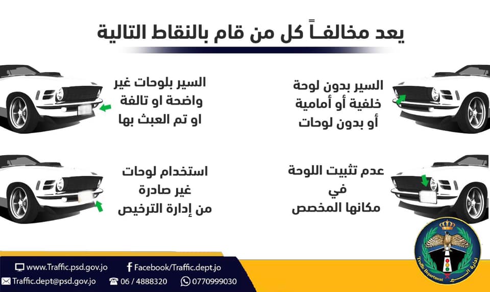 | قالت ادارة السير المركزية إن عدم وضع لوحة الأرقام الأمامية أو الخلفية يعد مخالفة. ودعت ادارة السير المركزية للحفاظ على وجود لوحة الأرقام في المكان المخصص، والابتعاد عن العبث بمواصفاتها. وبينت أن المخالفة تسجل في حال السير بدون لوحة خلفية أو أمامية أو بدون لوحات، أو السير بلوحات غير واضحة أو تالفة أو تم العبث بها، أو عدم تثبيت اللوحة في مكانها المخصص، واستخدام لوحات غير صادرة من إدارة الترخيص. |
