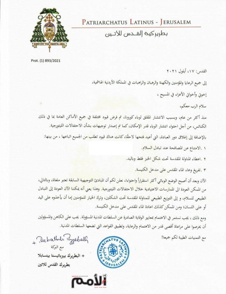 عمم البطريك بييرباتيستا بيتسابلا بطريرك القدس اللاتين على الكنائس في الأردن تعليمات جديدة.