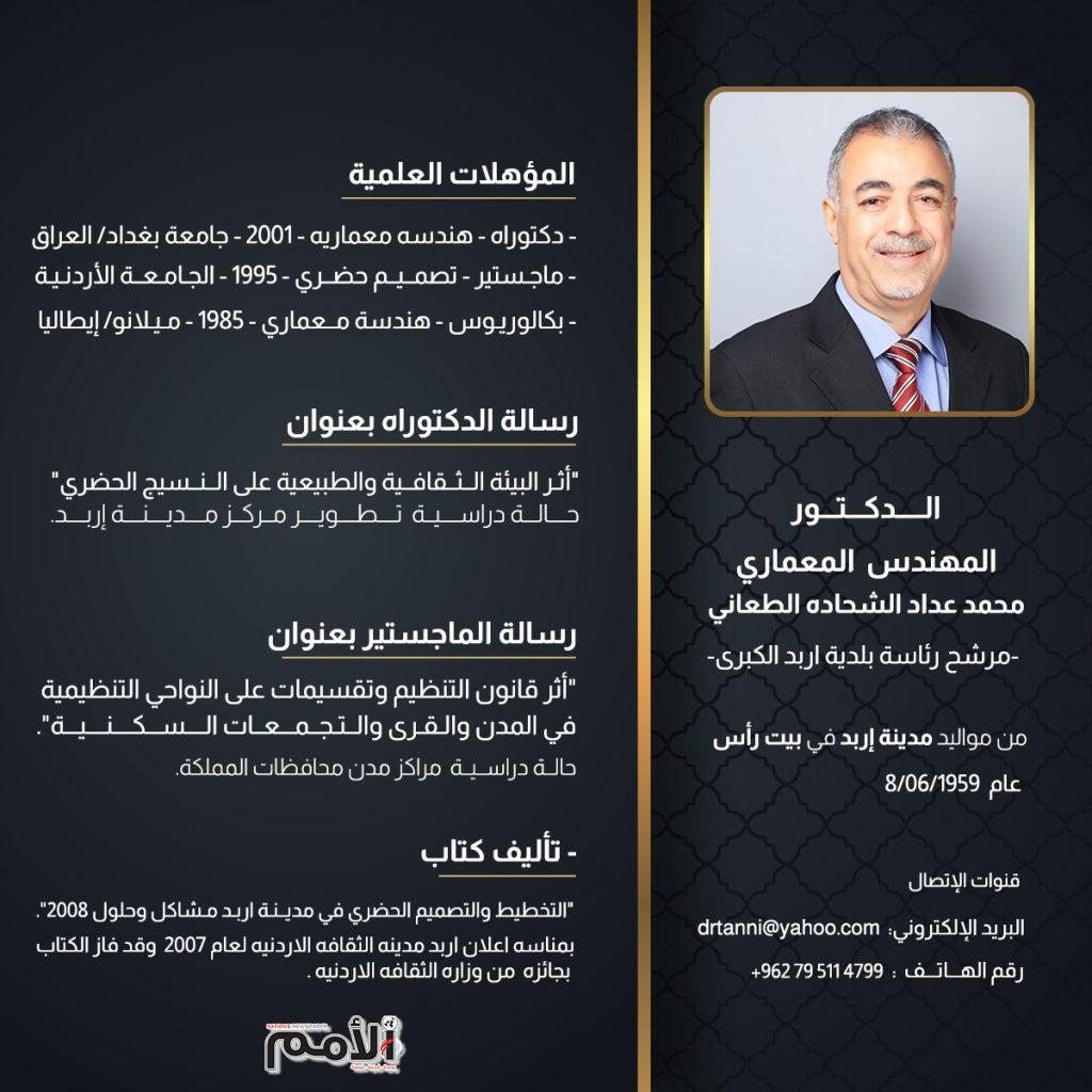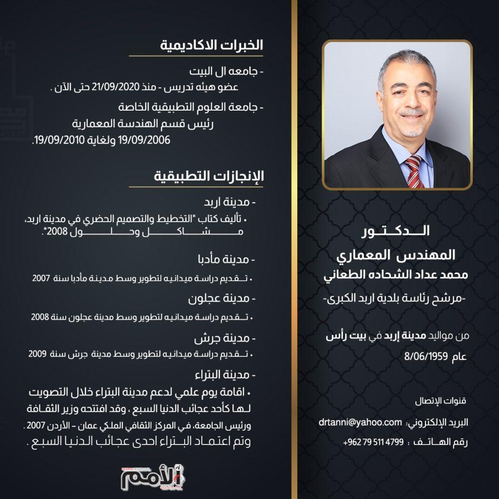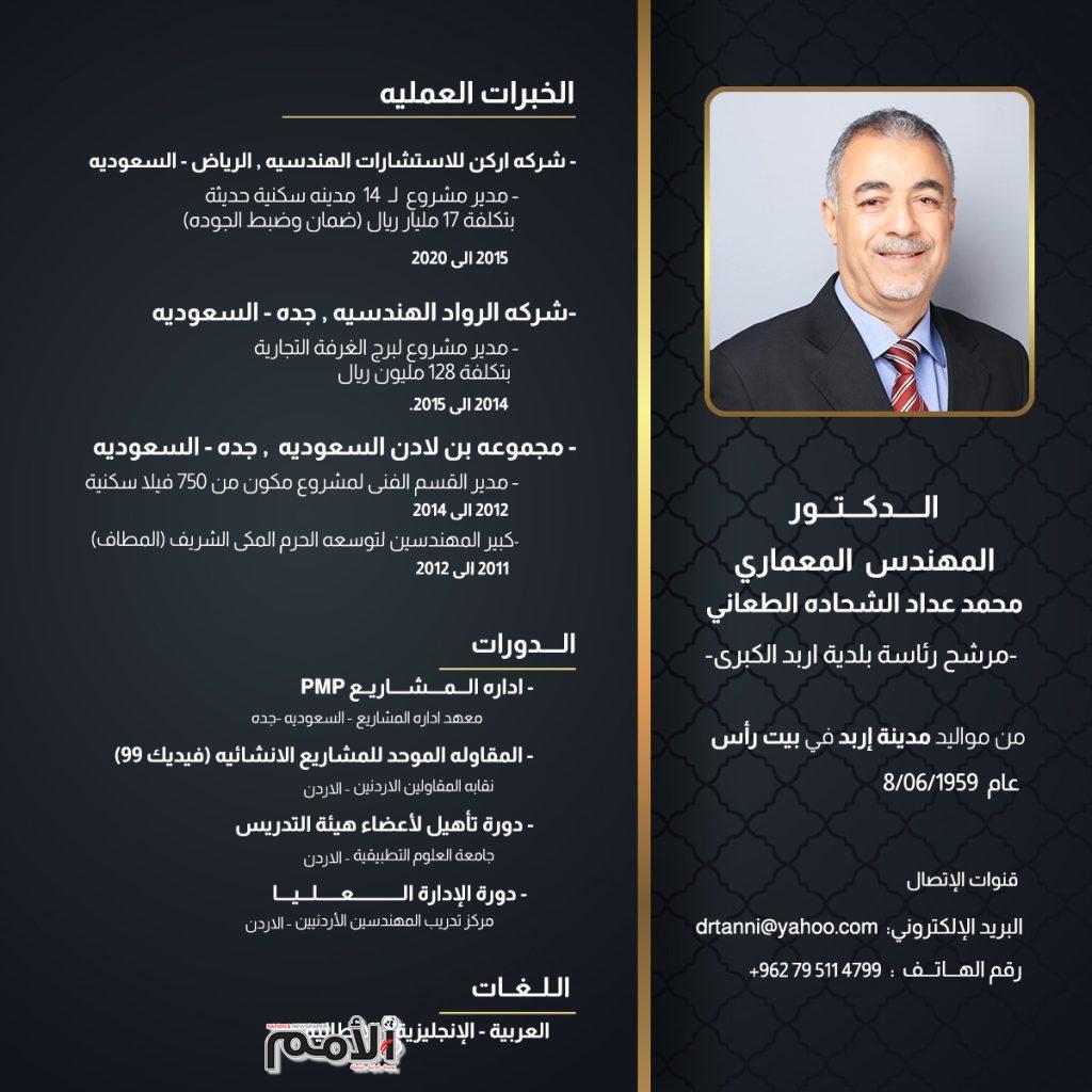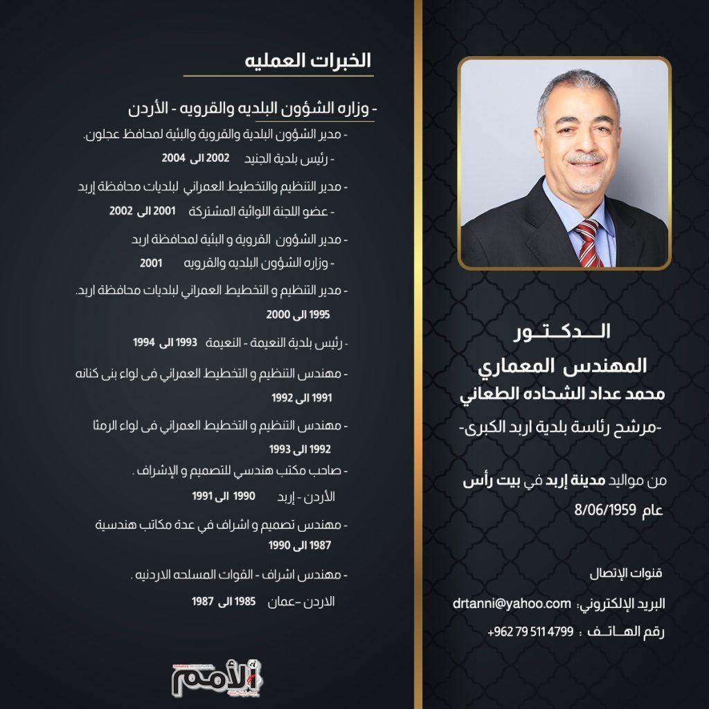 بعد خبرة طويلة ومضنية في العمل البلدي منذ عام 1991 وتنقله في مواقع عديدة في البلديات كمدير للشؤون البلدية والقروية ومديرا للتنظيم والتخطيط العمراني لبلديات محافظة اربد ورئاسته لعدة بلديات وتميزه في العمل الهندسي المعماري أعلن المرشح الدكتور المهندس المعماري “محمد عداد الشحادة الطعاني” عن نيته ورغبته بالترشح لانتخابات رئاسة بلدية اربد الكبرى المقبلة .