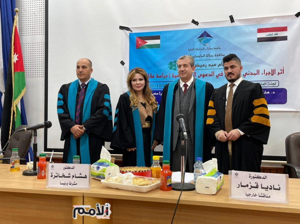 حيث تمت المناقشة بحضور عميد كلية القانون في جامعة جدارا الاستاذ الدكتور علي جبار