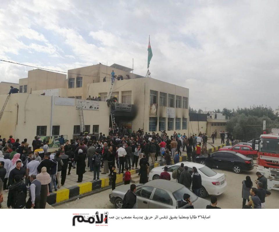 الرمثا – أصيب 36 طالب ومعلما في مدرسة مصعب بن عمير الثانوية للبنين في لواء الرمثا بضيق تنفس جراء حريق شب صباح اليوم في المدرسة وفق الدفاع المدني.