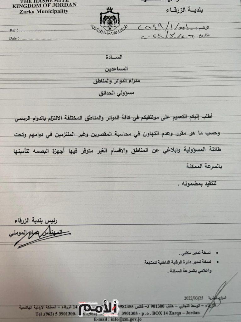 اوعز رئيس بلدية الزرقاء عماد المومني لكافة موظفي البلدية بضرورة الالتزام بالبصمة صباحا ومساء، رغبة منه في تجويد وضبط العمل .