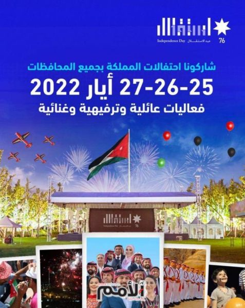 – أعلنت لجنة احتفالات المملكة بعيد الاستقلال السَّادس والسَّبعين، عن برنامج الفعاليَّات والأنشطة التي ستقام بهذه المناسبة في جميع محافظات المملكة، بدءاً من يوم الأربعاء المقبل، ولمدَّة ثلاثة أيَّام.