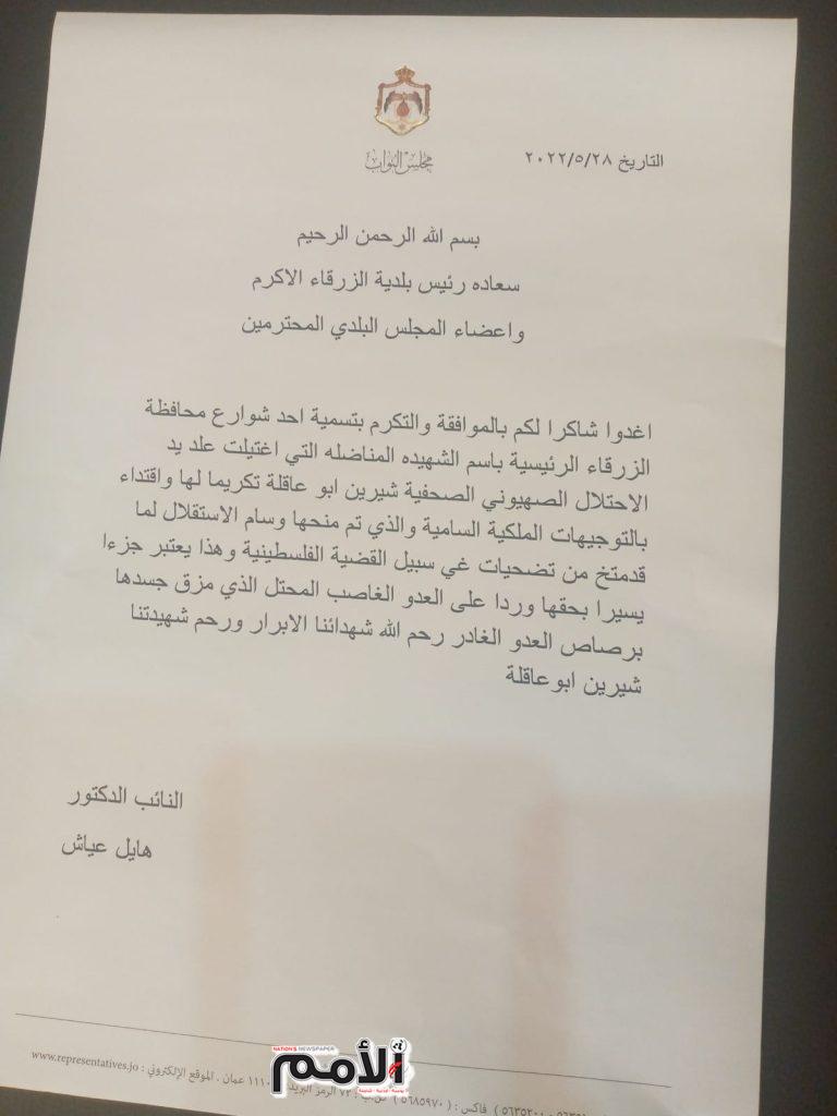طالب النائب الدكتور هايل عياش رئيس بلدية الزرقاء المهندس عماد المومني تسمية شارع باسم الشهيدة شيرين ابو عاقلة في محافظة الزرقاء التي اغتيلت على يد الاحتلال الصهيوني .
