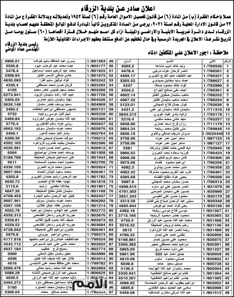نشرت بلدية الزرقاء 3 دفعات جديدة ( السابعه والثامنة والتاسعة ) من اسماء الأشخاص المتخلفين عن دفع الضرائب المترتبة عليهم لصالح البلدية.