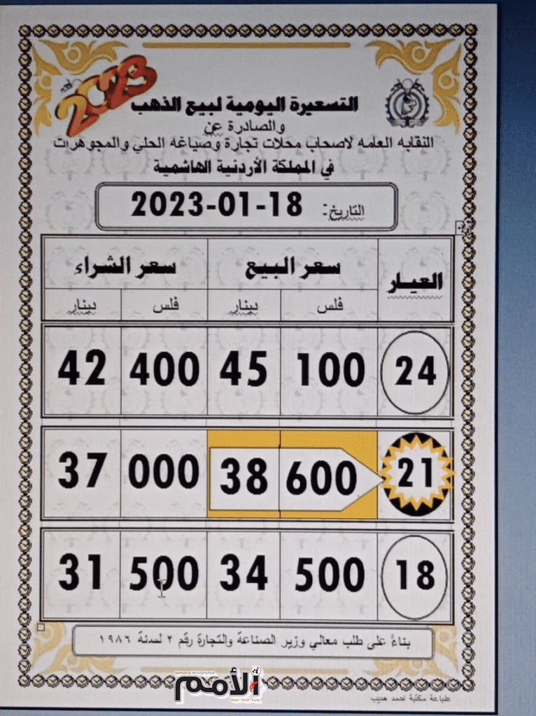 وبلغ سعر الغرام الواحد من الذهب (عيار 21) الأكثر طلبا بين المواطنين 38.60 دينارا لجهة البيع، و 37.00 دينارا لجهة الشراء من المواطنين.