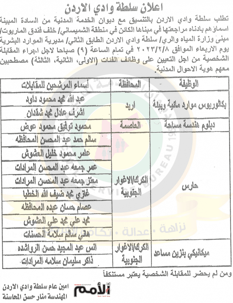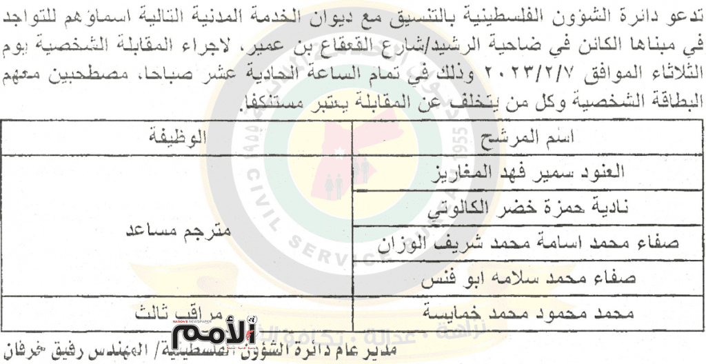 – دعا ديوان الخدمة المدنية بالتنسيق مع عدد من الوزارات والمؤسسات الحكومية الأشخاص التالية لإجراء المقابلات الشخصية والامتحان التنافسي .