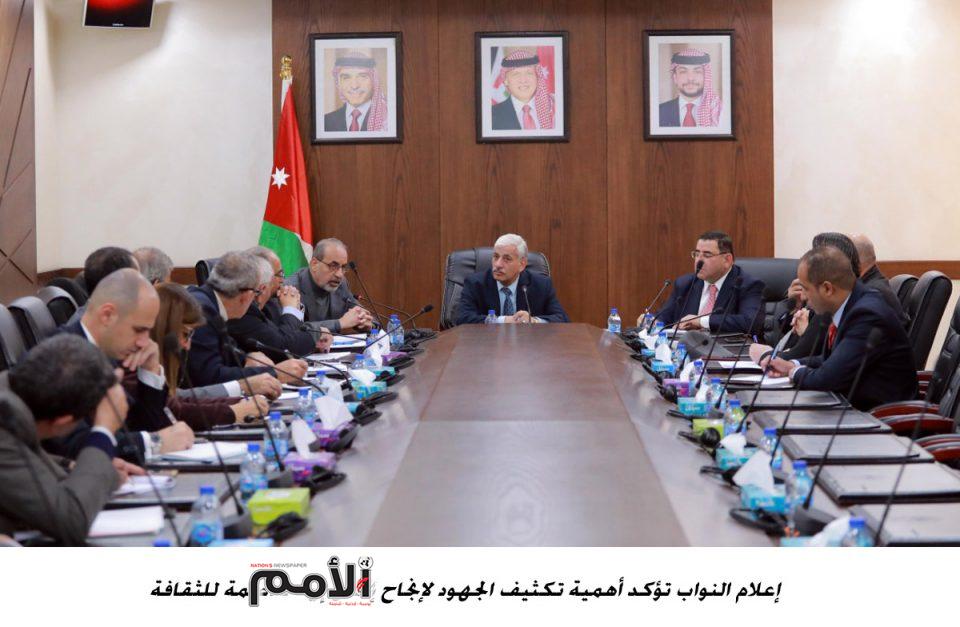 دعا رئيس لجنة التوجيه الوطني والإعلام والثقافة النيابية، محاسن الشرعة، لتكثيف الجهود لإنجاح إعلان إربد عاصمة للثقافة العربية لعام 2021، وتقديم كل الدعم من أجل ذلك.