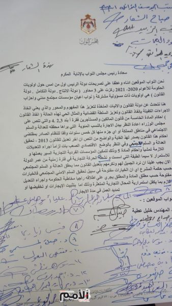 عمان – الأمم – طالب نواب من رئيس الوزراء بتثبيت الإيجارات او تخفيضها او تمديد العمل في مدة الايجار وفقا لقانون المالكين والمستأجرين .
