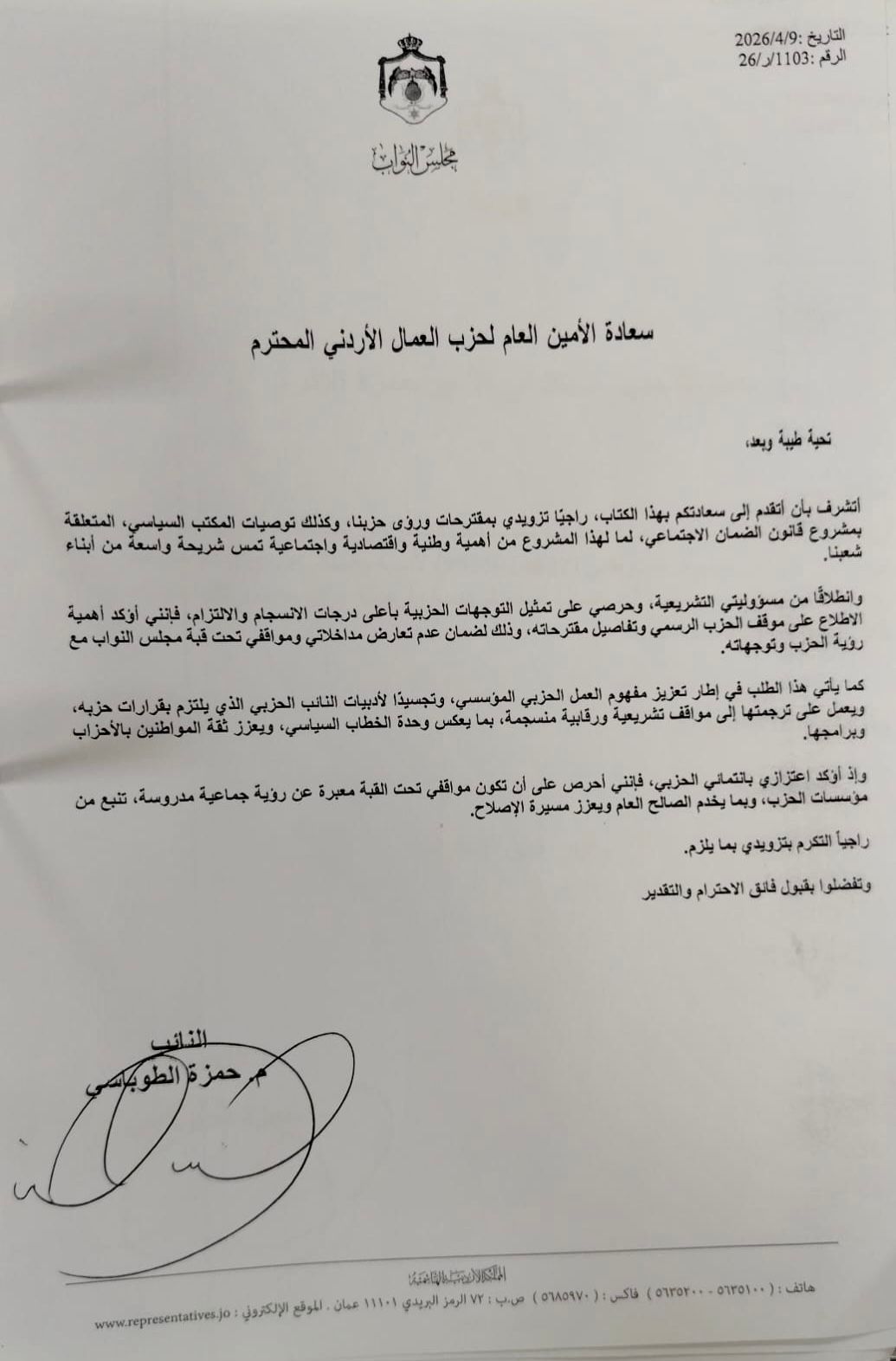وجاء طلب الطوباسي وفق ما قال، في إطار تعزيز مفهوم العمل الحزبي المؤسسي، وتجسيدا لأدبيات النائب الحزبي الذي يلتزم بقرارات حزبه ويعمل على ترجمتها إلى مواقف تشريعية ورقابية منسجمة، بما يعكس وحدة الخطاب السياسي، ويعزز ثقة المواطنين بالأحزاب وبرامجها.