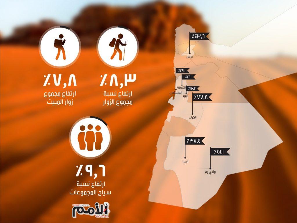 وأظهرت النشرة ارتفاعا في أعداد زوار المواقع السياحية والأثرية مقارنة بالفترة ذاتها من عام 2018، حيث بلغ في البترا 070ر042ر1 زائرا بنسبة ارتفاع بلغت 4ر37 بالمئة، وفي جرش 346ر442 زائرا بنسبة ارتفاع 6ر43 بالمئة، وفي الكرك 438ر45 زائرا بنسبة ارتفاع 8ر77 بالمئة، وفي وادي رم 751ر339 زائرا بنسبة ارتفاع 1ر51 بالمئة، وفي المغطس 127ر170 زائرا بنسبة ارتفاع 1ر29 بالمئة، وفي مأدبا الخارطة 800ر433 زائرا بنسبة ارتفاع 49 بالمئة، وفي جبل نيبو 924ر621 زائرا بنسبة ارتفاع 2ر40 بالمئة.