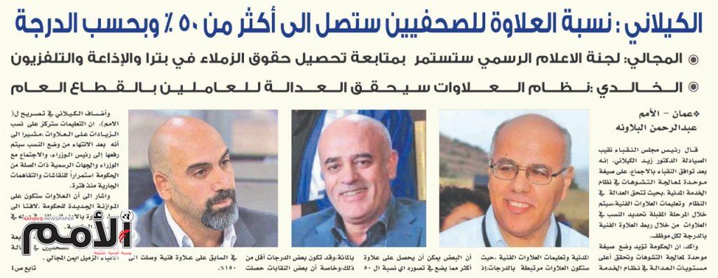 الزميل أيمن المجالي عضو اللجنة المشكلة لمتابعة أوضاع الصحفيين في الاعلام الرسمي يناقض هذا الكلام،ويرى أن لا دور لنقيب الصحفيين ولا لنائبه في موضوع العلاومة ،فقد اجتمعنا أكثر من أجتماع كلجنة ،ولوحنا بالوقوف أمام نقابة الصحفيين للحصول على العلاوة ،لكن جاءتنا تطمينات من الحكومة ،مبينا ان العلاوة نتابعها ونطالب بها منذ سنوات ولولا العلاوة التي اقرت للمعلمين لن نحصل عليها.