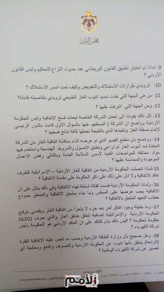 وقال ” ما حقيقة وجود اتفاق آخر يعد جزء لا يتجزأ من اتفاقية الغاز ويقضي بتوقيع الحكومة الأردنية والإسرائيلية إضافية تتعلق بتدفق الغاز والذي يعرف (G2G) حكومة لحكومة ؟ اليس ذلك يدل كذلك على ان العاقد الأردني هو الحكومة وليس شركة الكهرباء، وهل صحيح بأن وزارة الطاقة الأردنية وحسب ما تنص عليه الاتفاقية الفقرة (الرابعة) يتعلق بأنها تنوب عن الحكومة الأردنية والتصرف والدفع ومعالجة أي تقصير عن شركة الكهرباء الوطنية ؟