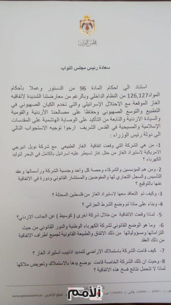 وقال في الاستجواب الذي قدمه الى رئيس مجلس النواب عاطف الطراونة ، رغم معارضتنا الشديدة لاتفاقيه الغاز الموقعة مع الاحتلال الإسرائيلي والتي تخدم الكيان الصهيوني في التطبيع والتوسع الصهيوني وحفاظا على مصالحنا الأردنية والقومية والسيادة الاردنية والنابعة من التأكيد على الوصاية الهاشمية على المقدسات الإسلامية والمسيحية في القدس الشريف ،فإنني أوجه الاستجواب الى رئيس الوزراء ، عن ما هية الشركة التي وقعت اتفاقية الغاز الطبيعي مع شركة نوبل انيرجي الامريكية لاستيراد الغاز من حقل غاز تسيطر عليه اسرائيل بالكامل في البحر لتوليد الكهرباء ؟