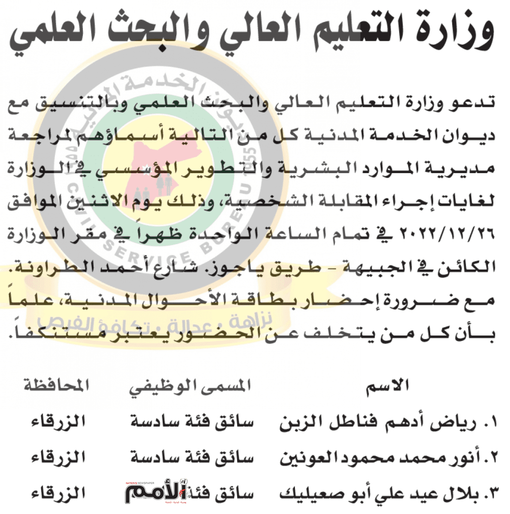 اعلن ديون الخدمة المدنية أسماء الناجحين في الامتحان التنافسي الالكتروني المنعقد بتاريخ 8-12-2022 وفقا للاعلان المنشور سابقا