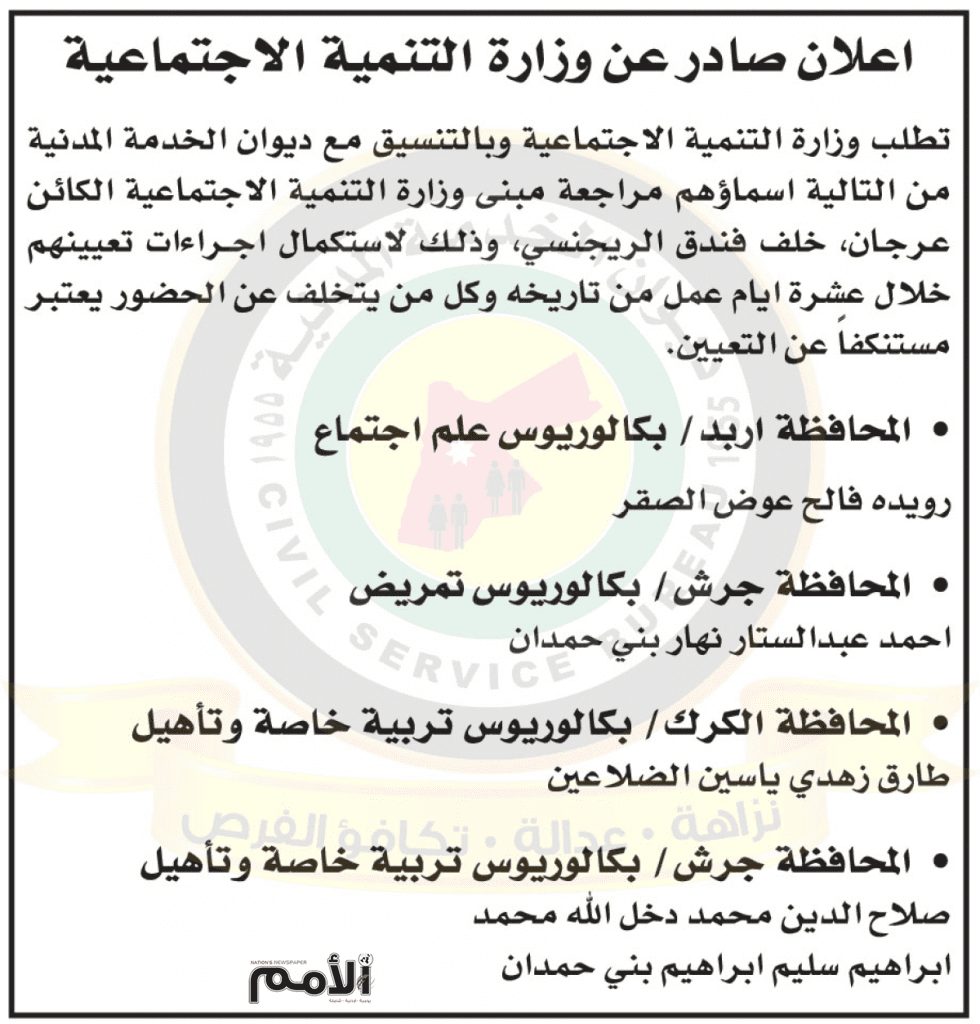 اعلان استكمال اجراءات التعيين صادر عن وزارة التنمية الاجتماعية