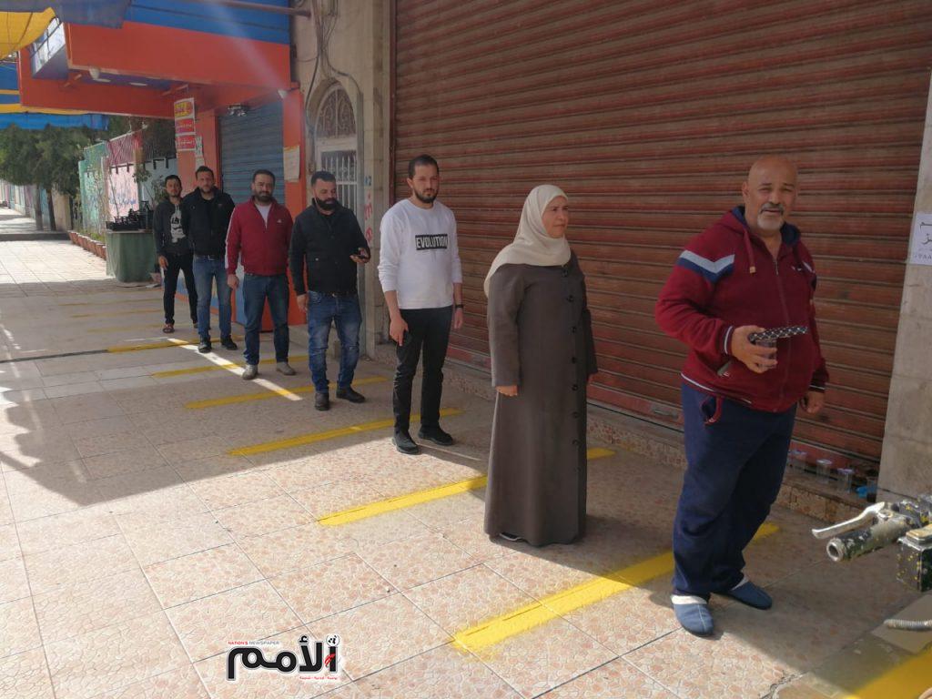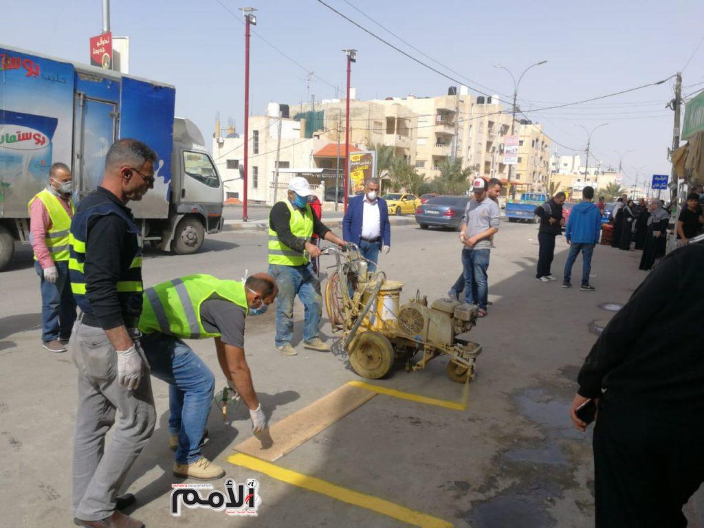 باشرت بلدية الزرقاء بالتخطيط امام المخابز والدكاكين والبقالات لتحديد المسافات بين المواطنين اثناء عملية الشراء من اجل حمايتهم .