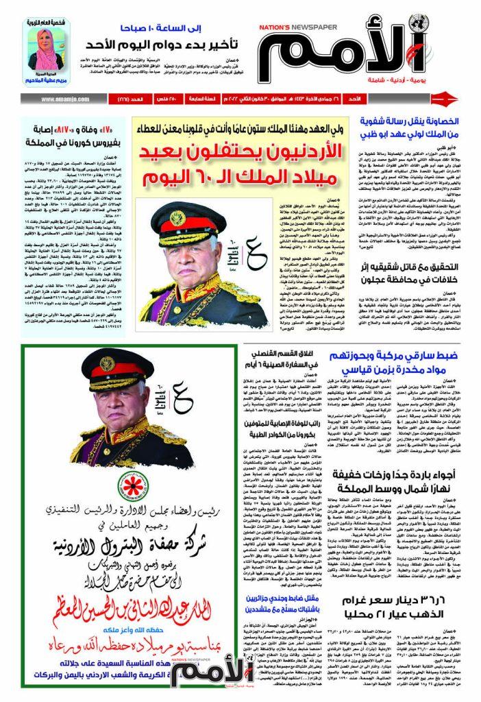 يُصادف اليوم الأحد، الموافق للثلاثين من كانون الثاني، العيد الستّون لميلاد جلالة الملك عبدالله الثاني؛ الابن الأكبر للمغفور له بإذن الله، جلالة الملك الحسين بن طلال، طيّب الله ثراه، وسمو الأميرة منى الحسين.