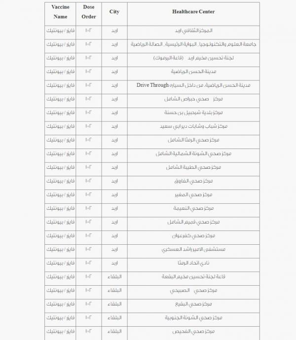 وأعلنت قائمة بأسماء مراكز تطعيم لقاح سينوفارم للجرعة الثانية ليوم الاربعاء لمن هم فوق سن ١٨، المبرمجة مسبقا والمتخلفين عنها وبدون موعد مسبق.