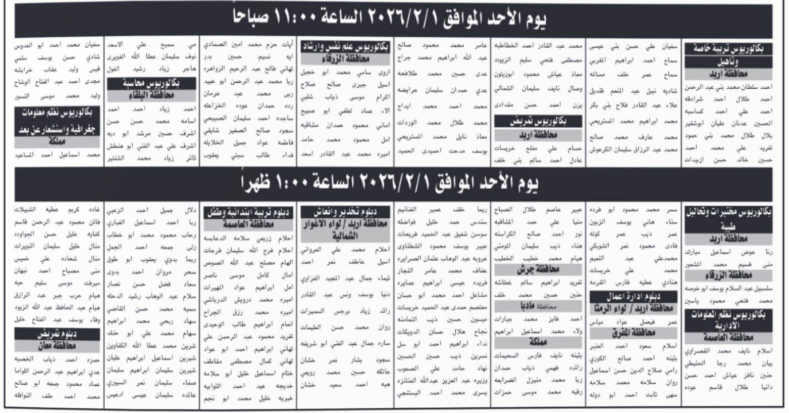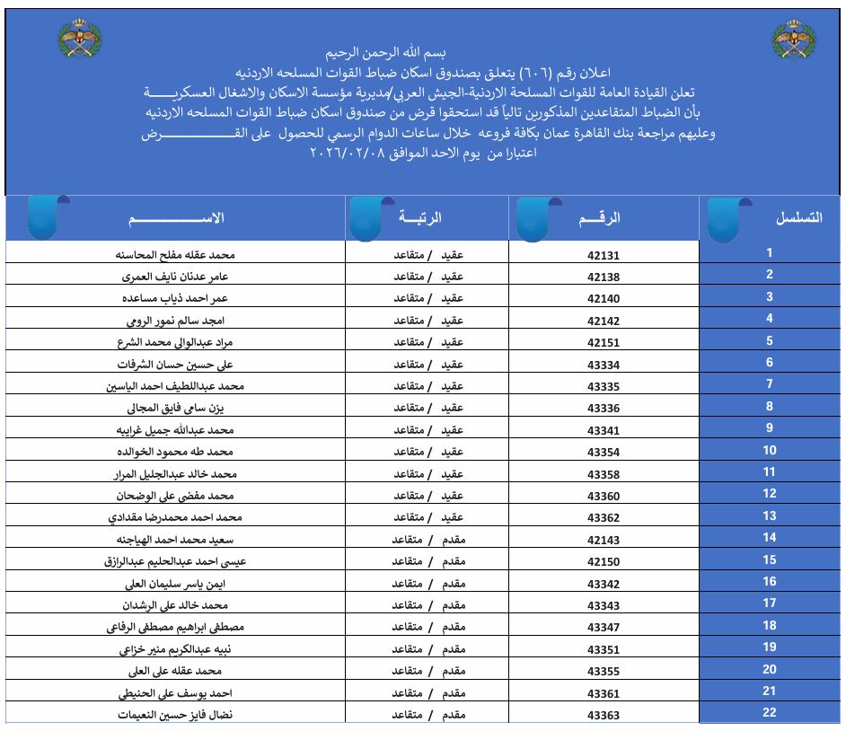 ودعت القيادة العامة الضباط المستفيدين إلى مراجعة بنك القاهرة عمان بكافة فروعه خلال ساعات الدوام الرسمي اعتباراً من يوم الأحد الموافق 8/02/2026 للحصول على القرض.