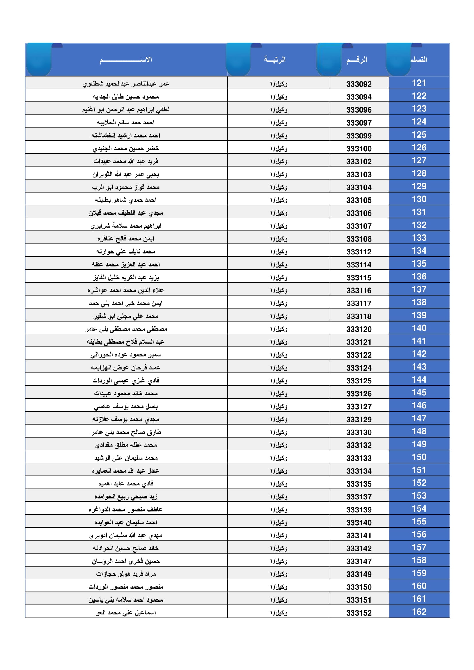 أعلنت القيادة العامة للقوات المسلحة الأردنية – الجيش العربي/ مديرية مؤسسة الإسكان والأشغال العسكرية بان الضباط وضباط الصف والأفراد المبينة أسماءهم أدناه قد استحقوا قرض الإسكان العسكري (الخاص بالأفراد) والضباط المستفيدين من صندوق إسكان الضباط.