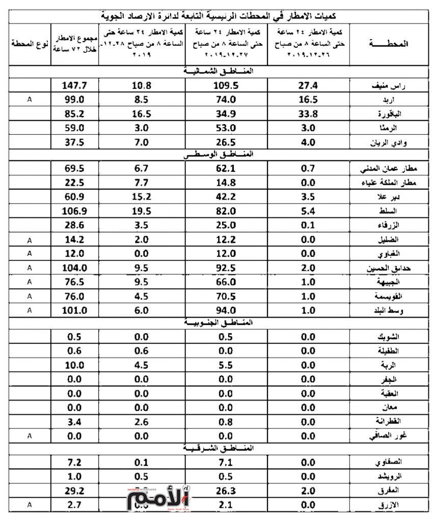 كما بلغت كمية الهطول في وسط البلد بالعاصمة عمان 101.0 ملم وفي إربد 99 ملم والباقورة 85.2 والرمثا 59 ومطار عمان المدني 69.5 والجبيهة 76.5 والزرقاء 28.6 والشوبك 0.5 ودير علا 60.9 والقويسمة 76.0 والغباوي 12.0 والمفرق 29.2 والصفاوي 7.2 والضليل 14.2.